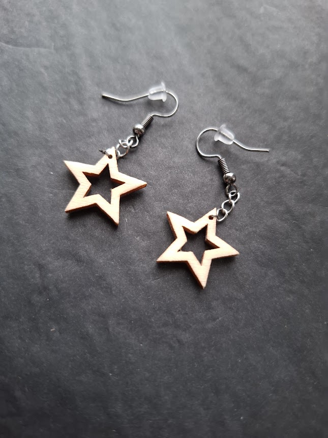 Zvaigznītes veidotas no 4mm saplākšņa. Kopējais auskara garums 2,5 cm. Zvaigznes izmērs 2 x 2 cm.