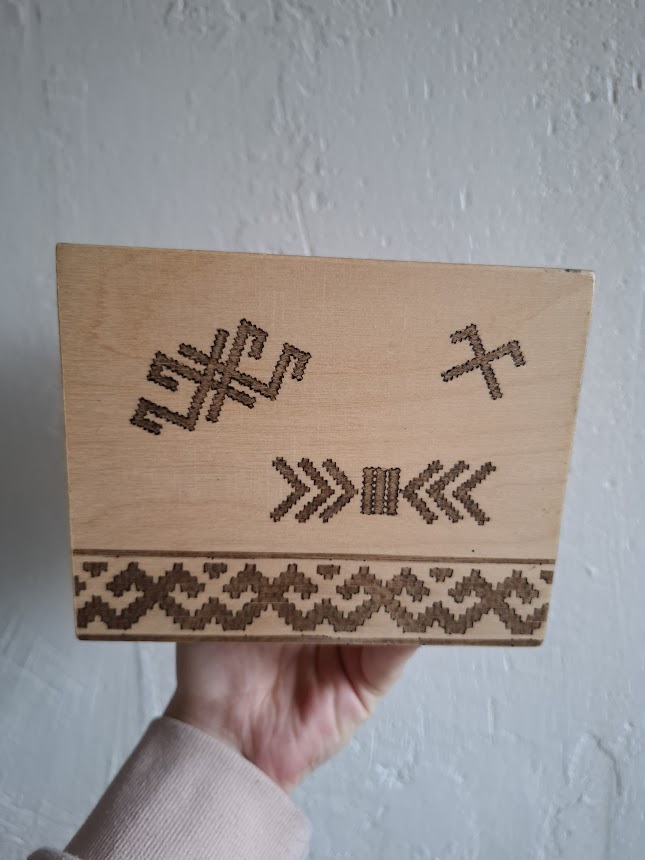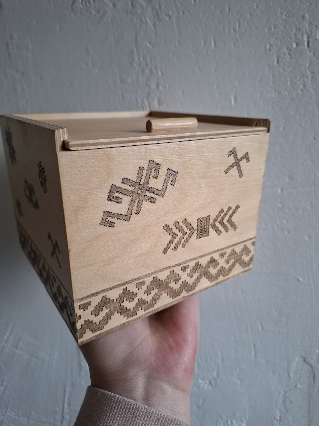 Visas kārbiņas malas ir apdrukātas ar etnogrāfiskajām zīmēm. Patriotiskā kārbiņa