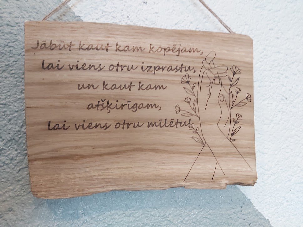 Omniva + 4,00 €Dēlīši dedzināti uz ozolkoka materiāla. Pēcapstrādei izmantota ūdens bāzes laka. Katram dēlītim tiek piestiprināta aukliņa ar āķīšu palīdzību.