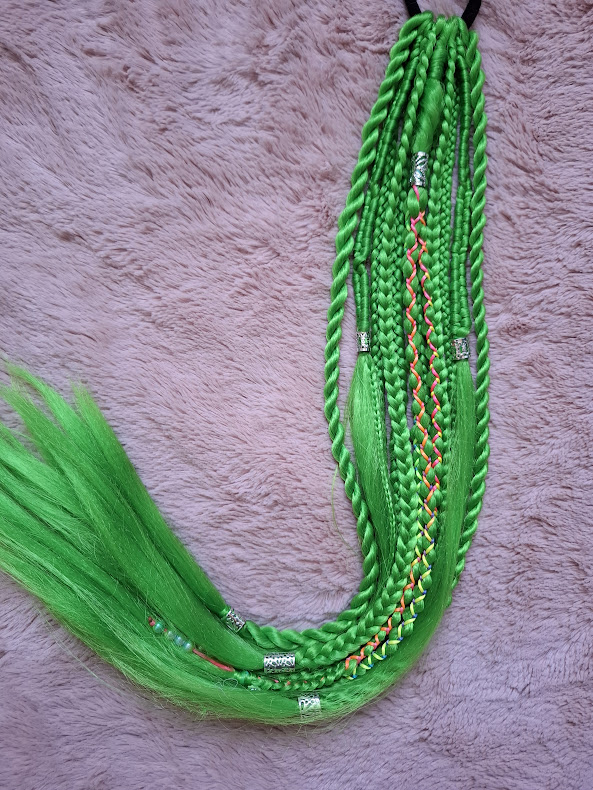 Spilgti zaļā krāsā ar sudraba aksesuāriem un mazām pērlītēm.