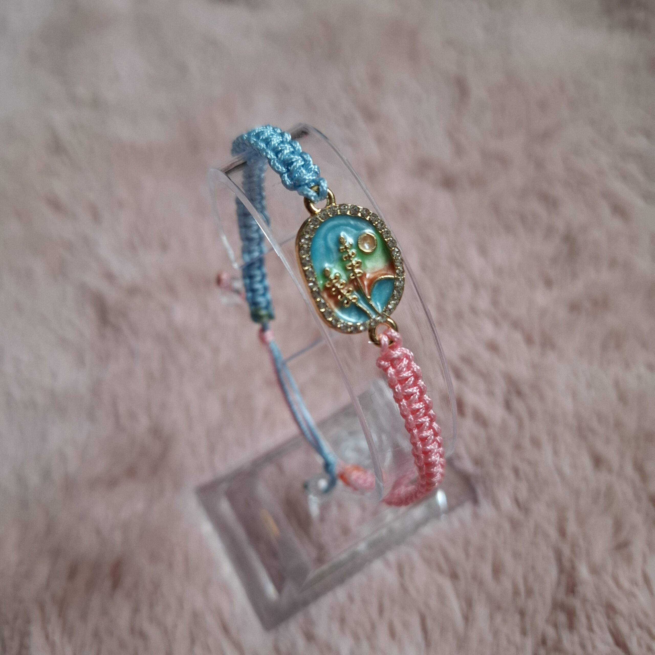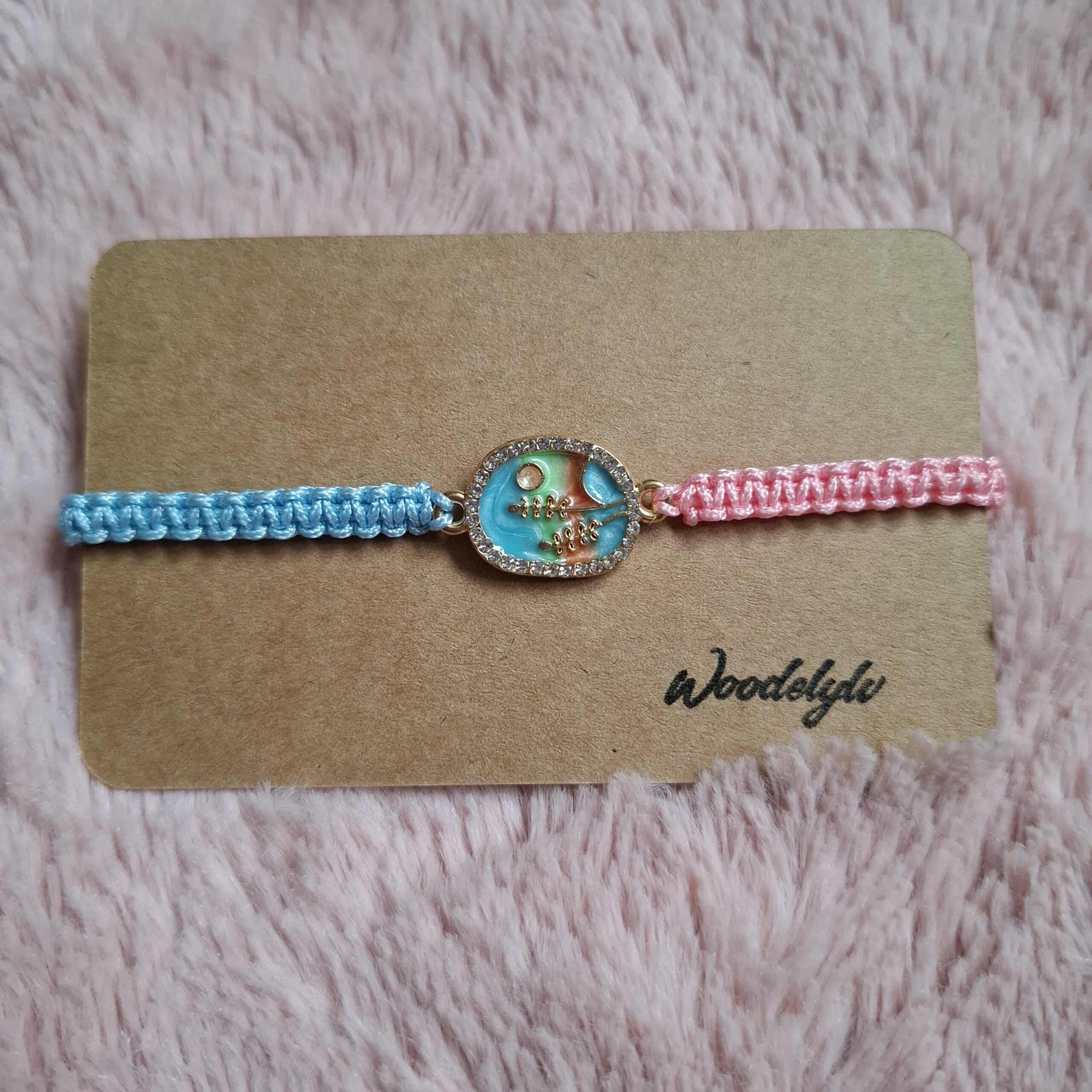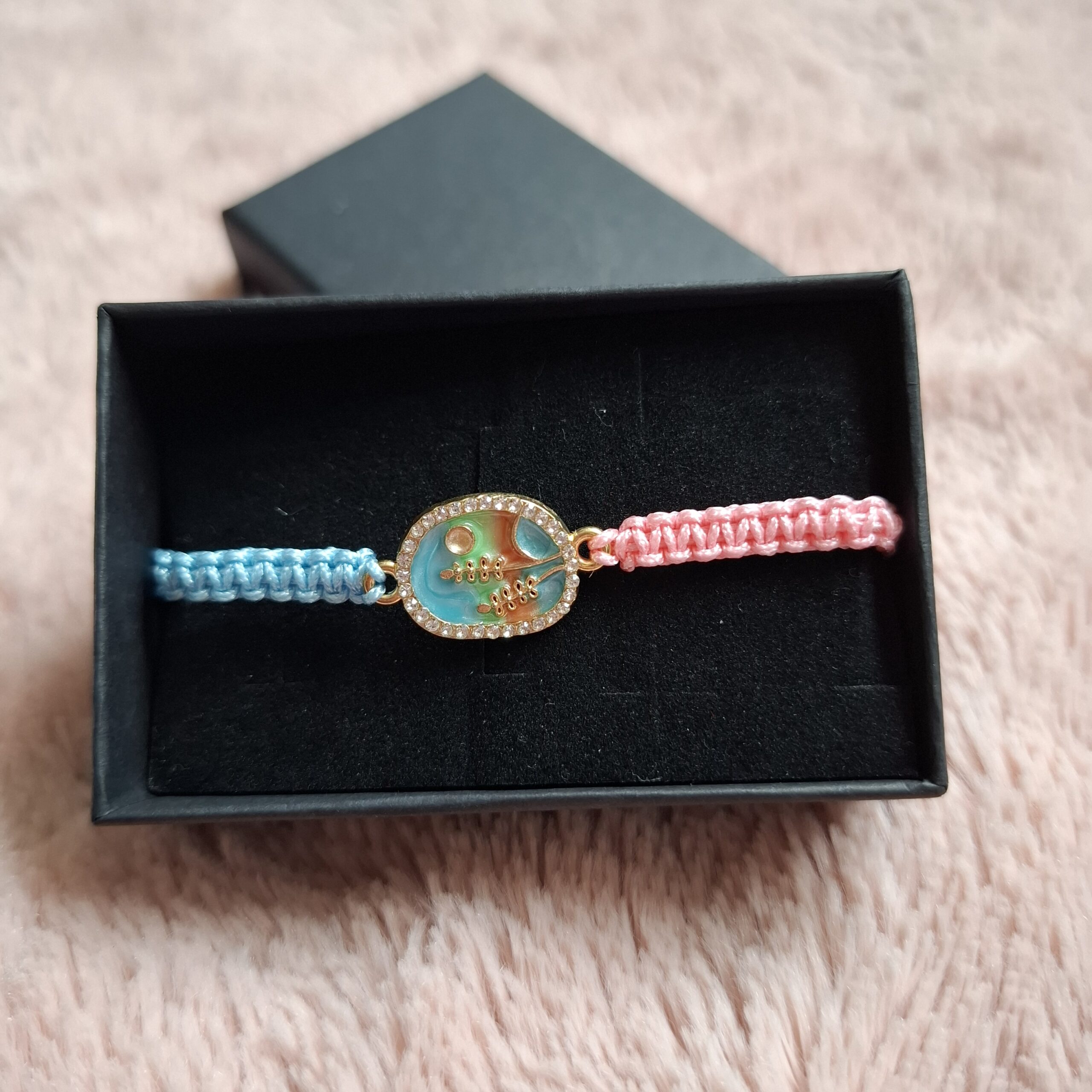 Šī ar rokām darinātā rokassprādze ir unikāls aksesuārs, kas apvieno pretstatu harmoniju. Tās divu krāsu pītais diegs – maigi rozā un debesu zils – simbolizē dienas un nakts, saules un mēness, vīrišķās un sievišķās enerģijas līdzsvaru.
